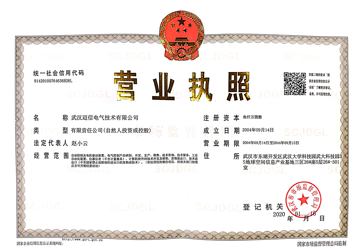 • 邁信電氣營業(yè)執(zhí)照 頒發(fā)時間:2020年1月 頒發(fā)單位:武漢市市場監(jiān)督管理局