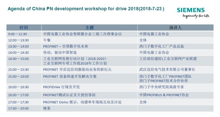 2018年7月23日~24日,中國(guó)電器工業(yè)協(xié)會(huì)變頻器分會(huì)三屆三次理事會(huì)暨西門(mén)子PROFINET技術(shù)開(kāi)發(fā)傳動(dòng)專題研討會(huì)在北京隆重舉行。武漢邁信電氣技術(shù)有限公司作為國(guó)內(nèi)首家成功研發(fā)出PROFINET伺服并支持PROFIDrive行規(guī)的伺服廠商受邀參加。