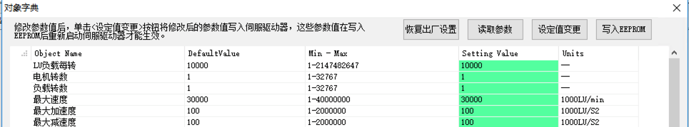 最大加減速度、Jog點(diǎn)動(dòng)參數(shù)、回零參數(shù)等都可通過(guò)ServoSoftStudio中的對(duì)象字典編輯器設(shè)置。