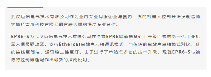 首頁>文章中心>應(yīng)用教程>EPR6-S機(jī)器人專用伺服與納博特控制器適配指南