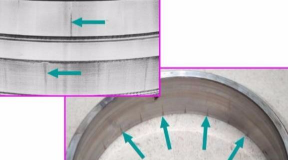 當(dāng)“走內(nèi)圈”時(shí),內(nèi)圈與軸之間的滑動(dòng)摩擦將產(chǎn)生高溫,由于內(nèi)圈端面與軸肩接觸面很小,其溫度會(huì)更高。使內(nèi)圈端面產(chǎn)生熱裂紋,熱裂紋的不斷延伸,將使軸承內(nèi)圈在使用中斷裂。