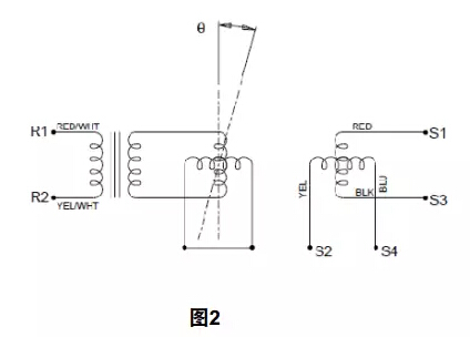與編碼器類似,旋轉(zhuǎn)變壓器也是將機械運動轉(zhuǎn)化為電子信號的轉(zhuǎn)動式機電裝置。但與編碼器不同的是,旋轉(zhuǎn)變壓器傳輸?shù)氖悄M信號而非數(shù)字信號?;窘M成方面,旋轉(zhuǎn)變壓器由1個一次繞組和2個相位在機械上成90°的二次繞組組成,見圖2所示。旋轉(zhuǎn)變壓器的輸出信號需要控制器能夠轉(zhuǎn)換模擬信號的信號輸入電路。