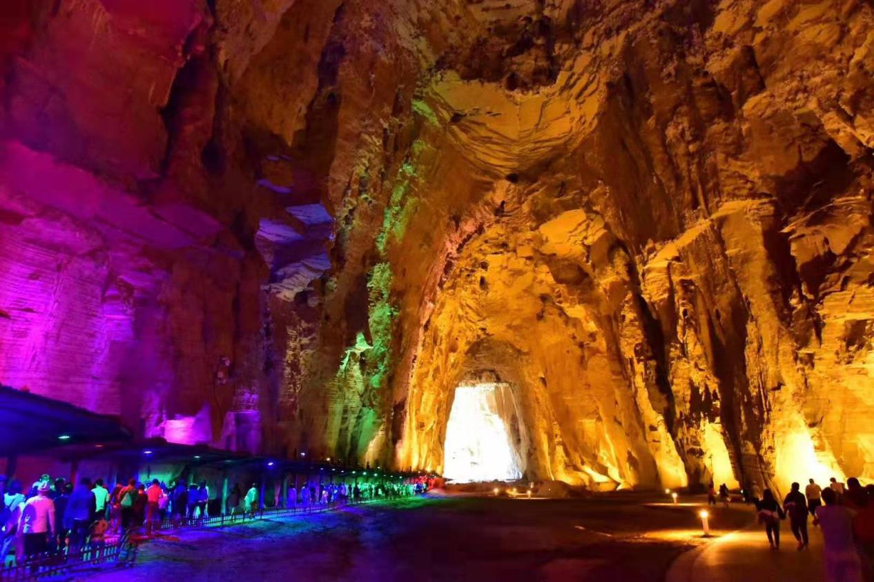 騰龍洞,2005年被評為中國“最具旅游價值溶洞”,由水洞、旱洞等景區(qū)組成。恩施人的母親河——清江由此進入地下,形成“臥龍吞江”的壯麗景觀,其旱洞洞中有山,山中有洞,等著我們?nèi)ヌ綄に纳衩啬獪y。當坐大巴車到達騰龍洞景區(qū)的時候,走過一段迂回曲折的 山間石板路,映入眼簾的就是清江水隨著奇特的山形地貌展現(xiàn)出來的“臥龍吞江”的壯觀畫面。每個看到這里的游客無不發(fā)出驚嘆之聲,并用手機記錄這一令人稱奇的景色。接著到達一壁之隔的旱洞,洞口的高度和寬度足以讓一架直升機輕松飛行,洞口的熱氣球也可以讓你領略到在洞口最高處盡收眼底的風景。隨著洞內(nèi)的指示牌往里走,洞內(nèi)氣溫會讓你感覺到絲絲涼意,但洞里的五彩斑斕的燈光映著蜿蜒曲折、奇形怪狀的巖石則別有一番景象。由于旱洞全長59.8公里,觀賞洞內(nèi)的原生態(tài)土家歌舞劇——《夷水麗川》和國內(nèi)獨一無二的光感藝術“激光秀”時,我們都是乘坐電瓶車到達觀賞地點,沿途的各種景象讓我們感到了人類無窮的創(chuàng)造力和創(chuàng)新力。激光秀的表演真正將光的技術發(fā)揮到極致,將人、光、水、舞臺藝術融合的天衣無縫,展現(xiàn)出無與倫比的藝術表演,令人震撼。原生態(tài)土家歌舞劇——《夷水麗川》則將土家族的民族文化以歌舞劇的形式表現(xiàn)出來,印象深刻的《六口茶》和《龍船調(diào)》讓人感覺親切又溫暖,同時又感受到了土家民族文化的博大精深。