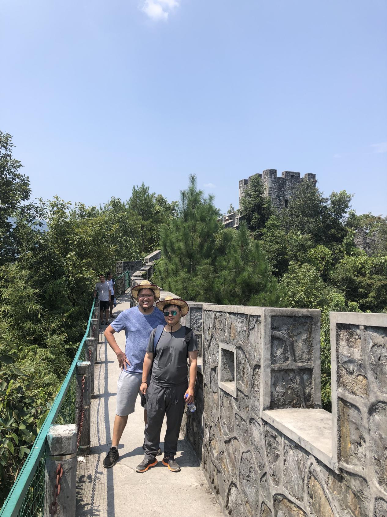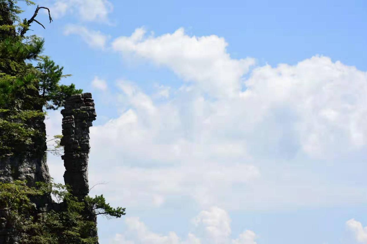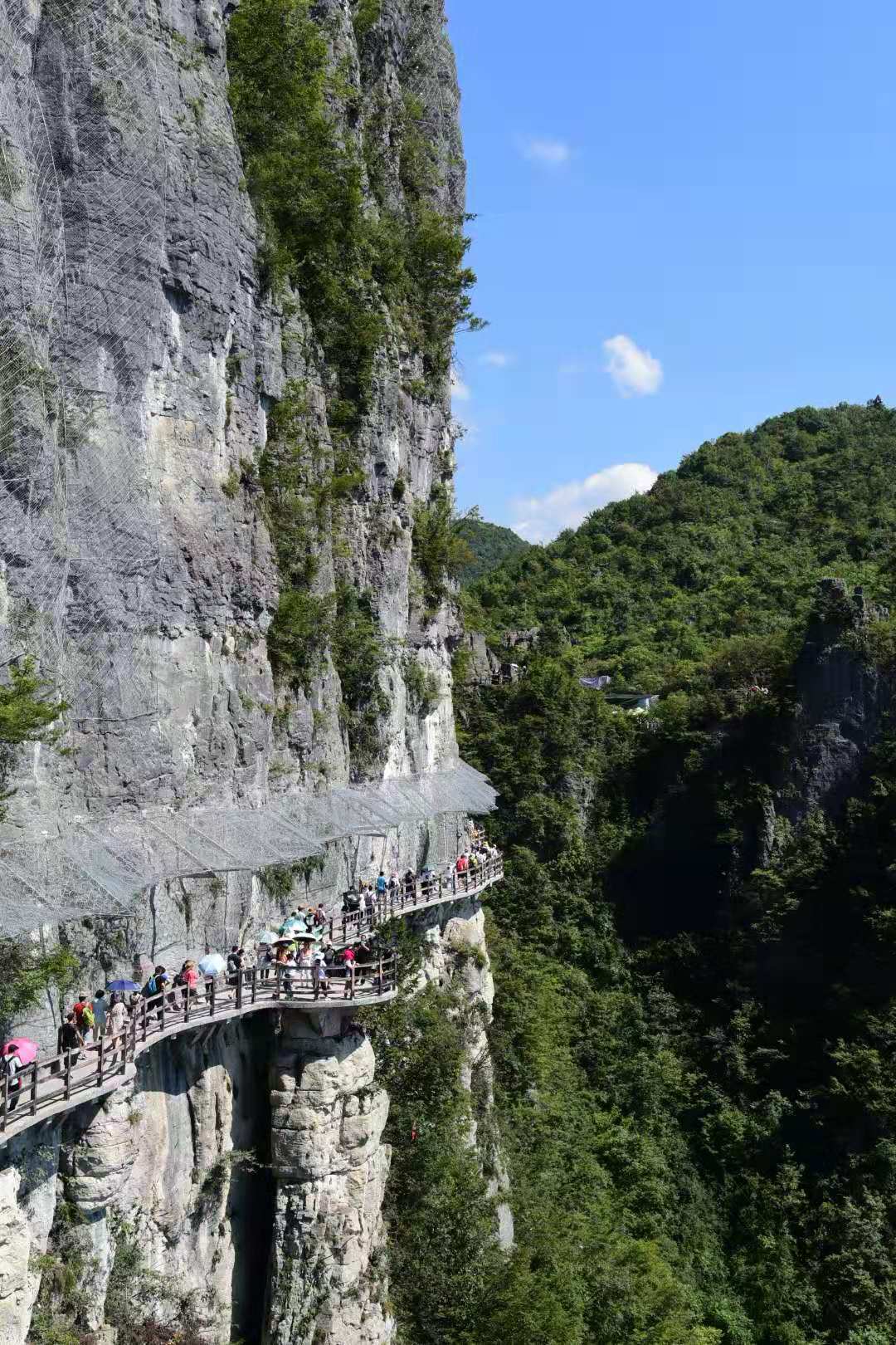隨著大巴車穿梭在險峻的山路中,幾經(jīng)顛簸后終于到達七星寨景區(qū),進入景區(qū)的我們一下子就被穿梭在奇山怪石間的索道、盤繞在崢嶸峭壁上的絕壁棧道吸引了。無論是想乘坐索道直達山頂,還是想克服恐懼,攀登絕壁征服高山,欣賞沿路的山河美景,都可以感受到這嶙峋絕嶺間壯觀的景象,感嘆大自然的鬼斧神工以及人類的匠心精神。華中科技大學著名的建筑與旅游專家張良皋教授認為恩施大峽谷是世界上最美麗的大峽谷,即使走馬觀花也令人如癡如醉,因為這里峽谷山峰險峻,山頭高昂,有仰天長嘯之浩氣;谷底的清江水質(zhì)清幽,令人有脫胎換骨之感受。沿著棧道一路攀爬,壯美無比的武陵風光如詩如畫:錯落有致的房屋、宛如玉帶一樣的河流、延綿百里的叢峰、藍的清澈的天空以及充滿仙氣形態(tài)各異的云朵。該棧道共有七道彎八道拐,寓意是:路七彎八拐,心始終如一。歌曰:北斗七星有七斗,絕壁棧道有七抖;經(jīng)過一番驚嚇后,人生道路手拉手。山間的景色更是令人稱絕,“一炷香”,高約150余米,最小直徑只有4米,它風吹不倒,雨打不動,傲立群峰之中千萬年,守護著這片神秘的土地,成了大峽谷中的鎮(zhèn)谷之寶。黃山有“迎客松”,這里則有鞠躬松,也是大峽谷的五大奇觀之一代表。這顆松代表我們好客的土家族、苗族人民向遠方的游客深深地鞠個躬,既表示歡迎,又代表恭送。盡管山路崎嶇,臺階時而陡峭,時而平坦,一路走來氣喘吁吁,汗流浹背,腿腳酸疼,但沿途的美景和戰(zhàn)勝自我的決心,讓我們在恐懼和興奮中爬完了七星寨景區(qū)的全程山路。