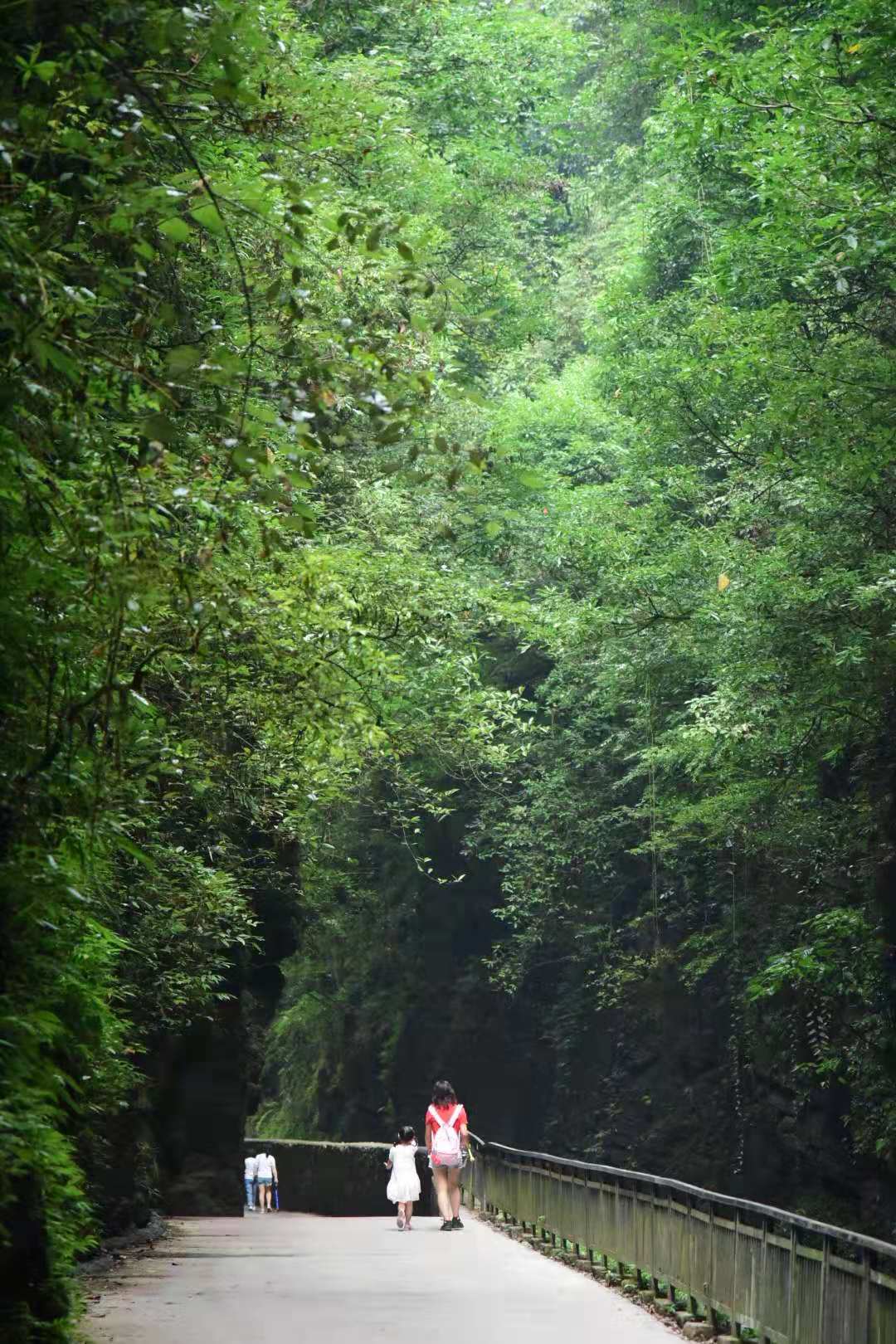 匆匆吃過午飯,稍作休息后,我們在導游的帶領下前往沐撫,游覽“云龍河地縫”,這是大峽谷2013年新增景點。地縫至少形成于5千萬年前,從地縫頂部到地縫底部的地層主要為形成于2.1-2.9億年間、跨二迭與三迭紀的灰?guī)r;全長3.6千米、平均深75米,平均寬15米,兩岸陡峭,飛瀑狂瀉,縫底流水潺潺,上通天水暗河,下聯(lián)莽莽清江,成為恩施大峽谷一大奇觀。游覽地縫,最令大家驚嘆的是山崖間飛瀉而下的瀑布,以及山間陡峭的巖石臺階。正午陽光照射進來,雖然炎熱,但山間瀑布流水帶來的清涼以及山頂流下的潺潺溪水,冰冰涼的感覺瞬間趕走午后的燥熱,讓人無不流連忘返。