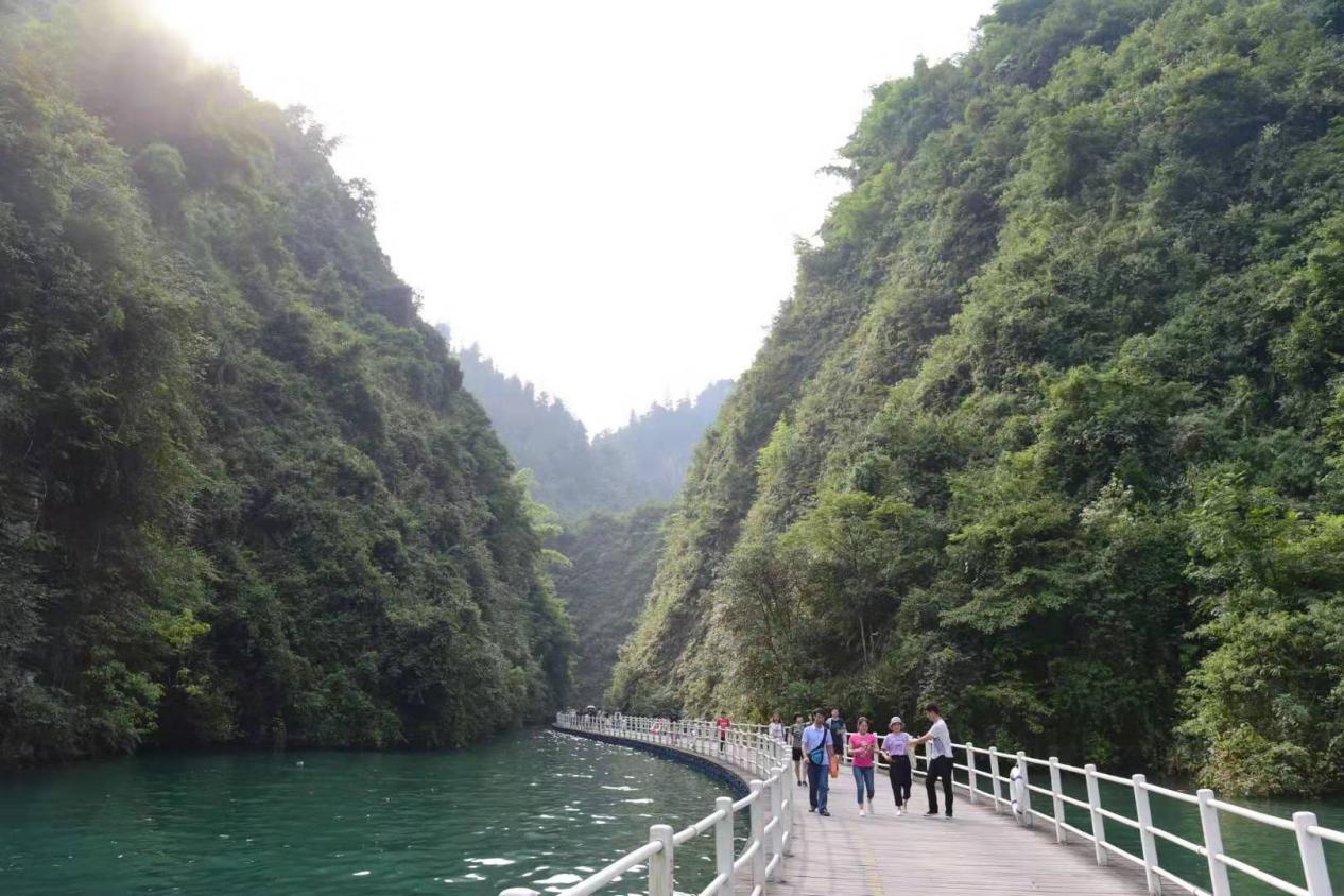 當太陽還沒爬上枝頭,我們在清晨的鳥兒叫聲中早早起來,開始了第三天的旅程。盡管爬山過后,大家的腿都有些酸痛,但依然擋不住大家對“湖北最美漂浮橋”的心心向往。吃過豐盛的早餐,大家又興趣盎然地隨著導游前往“獅子山風景區(qū)”。因為在這里,我們可以見到被廣大網(wǎng)友稱為“湖北最美漂浮橋”的水上棧道,也稱“廊橋遺夢”。“水上棧道”長約500米,寬4.5米,順著蜿蜒的河道建設而成。當我們成群結隊走在浮橋上面,兩岸層巒疊翠,群峰莽莽,萬樹蔥蘢呈玉錦,鋪紅綴綠。林間鳥語花香,花叢蜂飛蝶舞,真叫人心曠神怡。行走在青山綠水間,無時不感受到土苗山鄉(xiāng)大自然的魅力。當環(huán)保電瓶車沿著山路在水上急馳,濺起一陣陣地水浪時,那排山倒海地氣勢還是震驚了我們所有人。